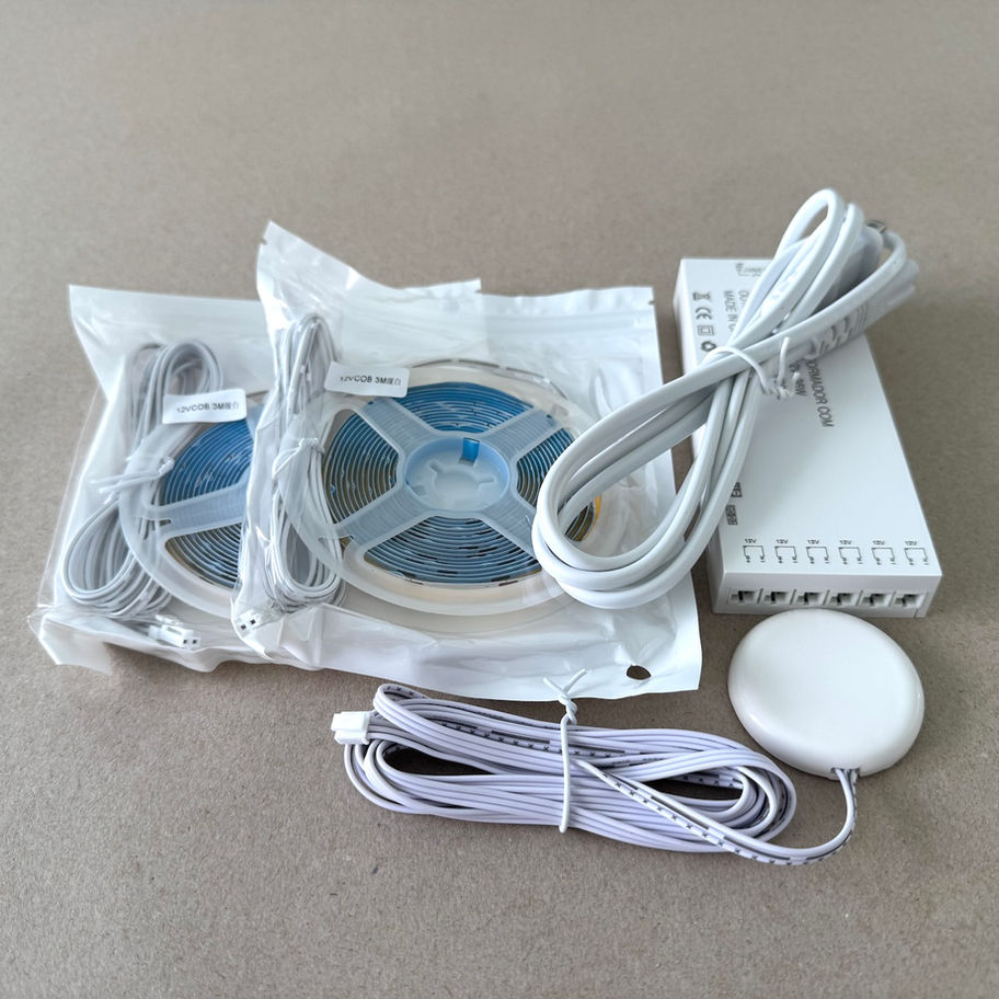 8 mm wide COB strips by 10 ft long each with warm 3000K light, with UL certified power adapter and sensor switch. Dimmable.